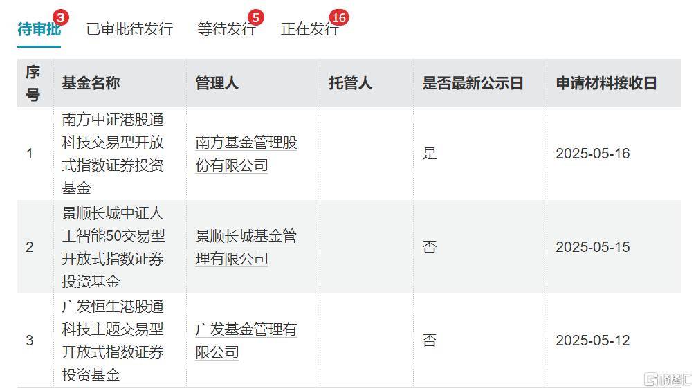 上报的3只股票ETF分别是南方中证港股通科技交易型开放式指数证券投资基金、景顺长城中证人工智能50交易型开放式指数证券投资基金和广发恒生港股通科技主题交易型开放式指数证券投资基金。