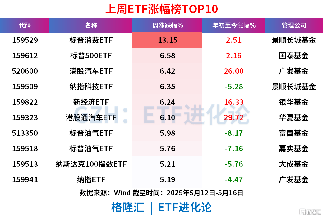 上周跨境ETF表现亮眼,景顺长城基金标普消费ETF、国泰基金标普500ETF、景顺长城基金纳指科技ETF、银华基金新经济ETF、富国基金标普油气ETF上周分别涨13.15%、6.58%、6.35%、6.24%和5.98%。