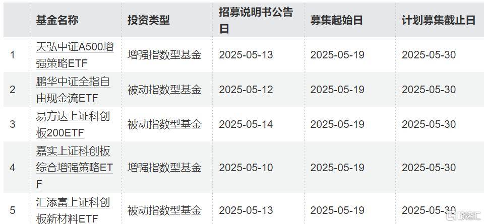 分别是天弘中证A500增强策略ETF、鹏华中证全指自由现金流ETF、 易方达上证科创板200ETF、嘉实上证科创板综合增强策略ETF和汇添富上证科创板新材料ETF。