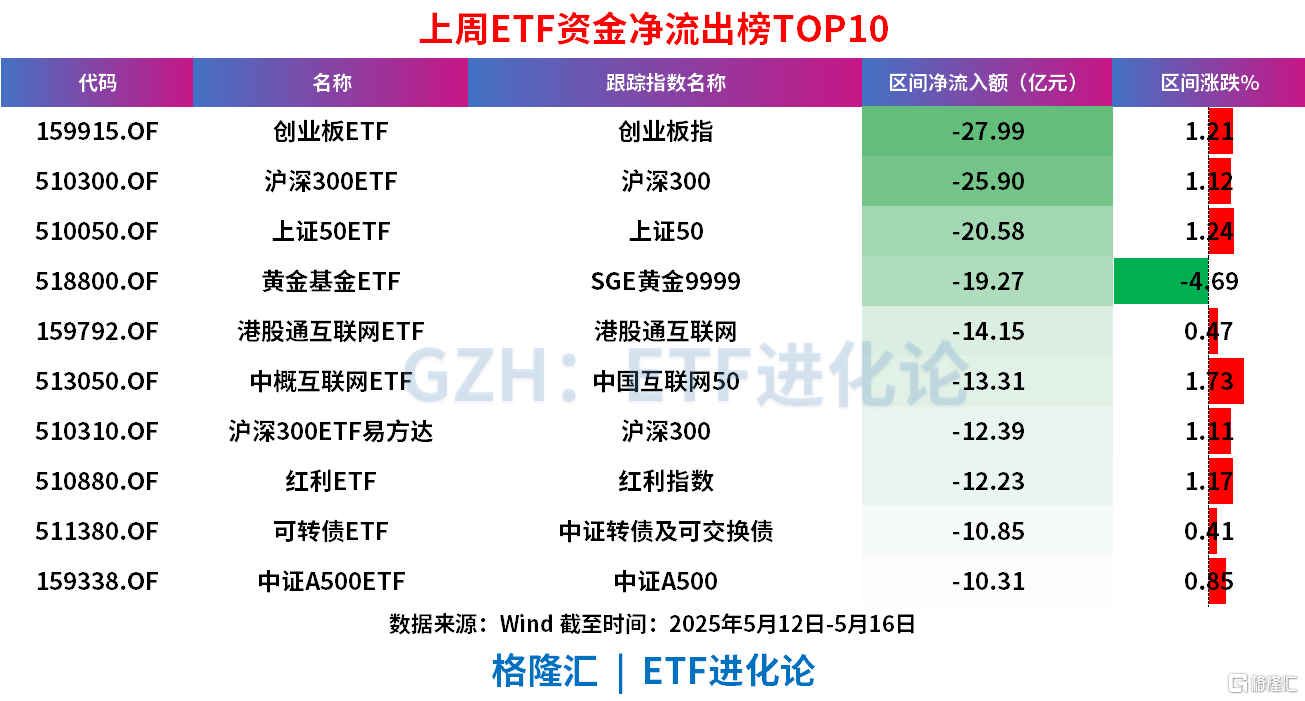 净流出方面,创业板ETF、沪深300ETF、上证50ETF、黄金基金ETF、港股通互联网ETF、中概互联网ETF上周分别净流出27.99亿元、25.90亿元、20.58亿元、19.27亿元、14.15亿元、13.31亿元。