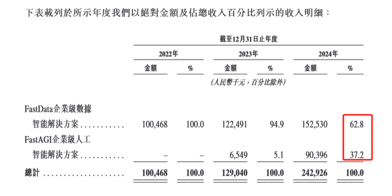 滴普科技收入主要来自于FastData企业级数据智能解决方案、FastAGI企业级人工智能解决方案,2024年收入占比分别为62.8%、37.2%。