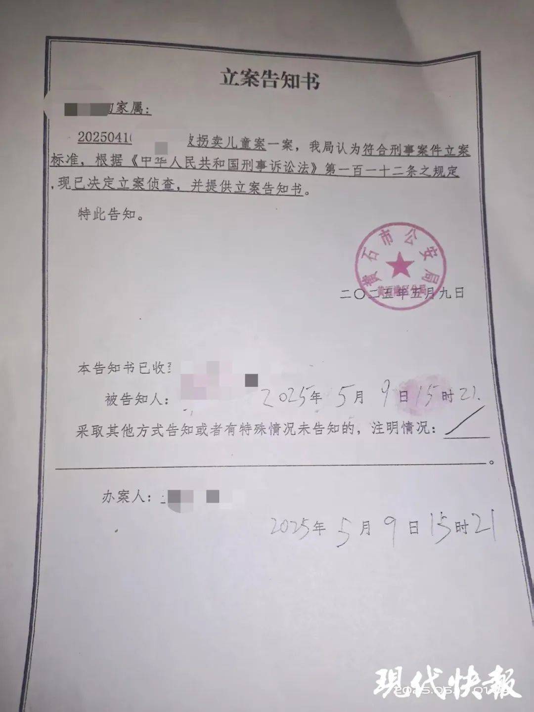 章先生向现代快报记者提供的立案告知书显示,黄石市公安局黄石港区分局是以“拐卖儿童”立的案。内容如下:XXX被拐卖儿童案一案,我局认为符合刑事案件立案标准,根据《中华人民共和国刑事诉讼法》第一百一十二条之规定,现已决定立案侦查,并提供立案告知书。落款日期为2025年5月9日。