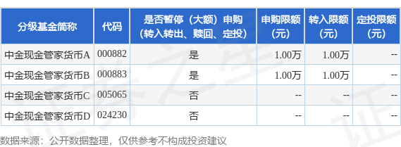 证券之星消息,5月20日中金基金管理有限公司发布《关于中金现金管家货币市场基金在特定渠道调整大额申购(包括转换转入、定期定额投资)业务的公告》。公告中提示,为保护中金现金管家货币市场基金份额持有人的利益,自2025年5月21日起中金现金管家货币市场基金在特定渠道调整大额申购(包括转换转入、定期定额投资)业务,申购、转换转入上限金额为1.0万元,下属分级基金调整明细如下: