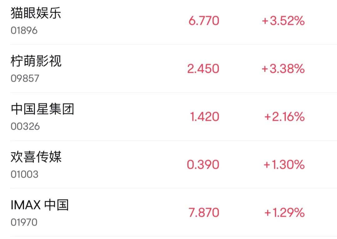 港股影视股跟涨,柠萌影视、猫眼娱乐涨超3%,中国星集团涨超2%,欢喜传媒、IMAX中国涨超1%。