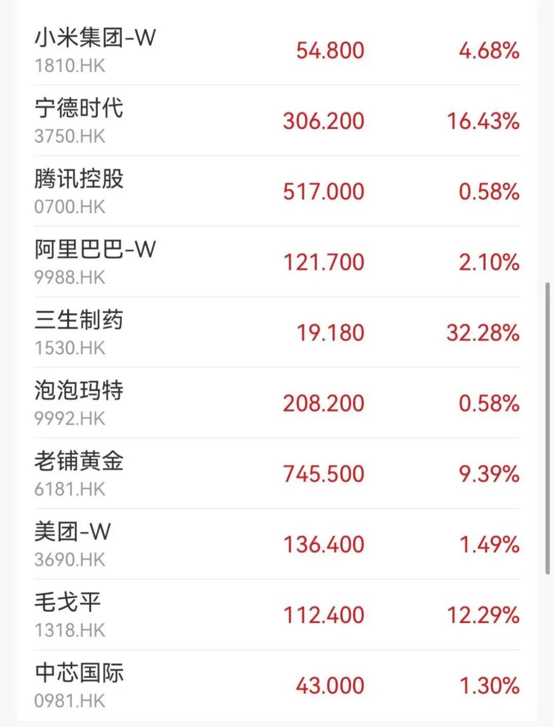 盘面上,大型科技股集体上涨,小米涨超4%,京东、阿里巴巴涨超2%,百度、网易、美团、腾讯、快手均上涨;医药股全天强势,三生制药大涨超32%,翰森制药、四环医药、石药集团、信达生物等跟涨;年内最大IPO宁德时代上市首日大涨超16%,带领锂电池股集体上扬,比亚迪股份、中创新航涨超2%。此外,汽车股、海运股、啤酒股、家电股、石油股等收涨。