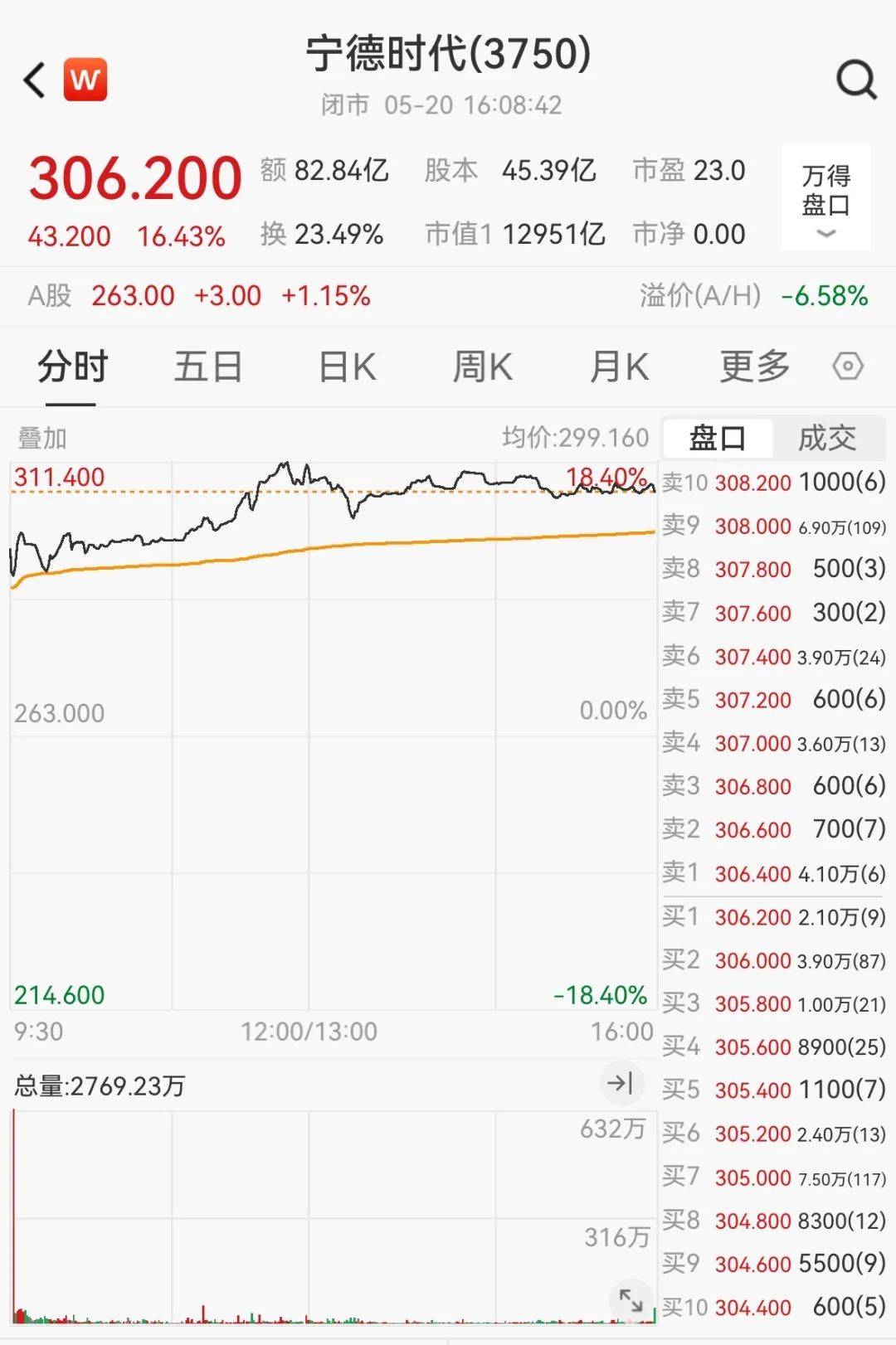 5月20日,宁德时代在港交所正式挂牌,上市首日收涨超16%,报306.2港元/股,总市值为12951亿港元。