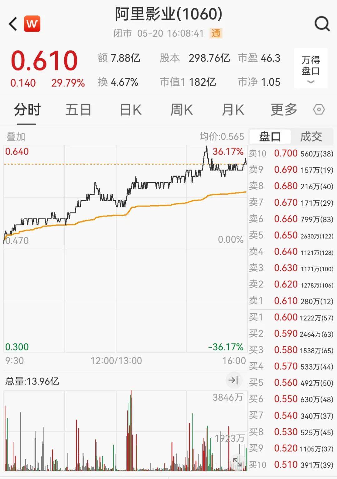 5月20日,阿里影业涨近30%,报0.61港元/股,最新总市值为182亿港元。