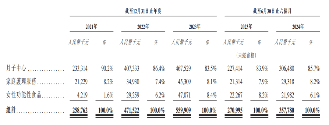 翻开招股书,圣贝拉将自己定义为一家综合家庭护理品牌集团,同时也是中国最大的产后护理及修复集团。公司业务涵盖了三大板块:月子中心(提供产后护理和修复服务)、家庭护理服务,以及女性健康功能性食品。