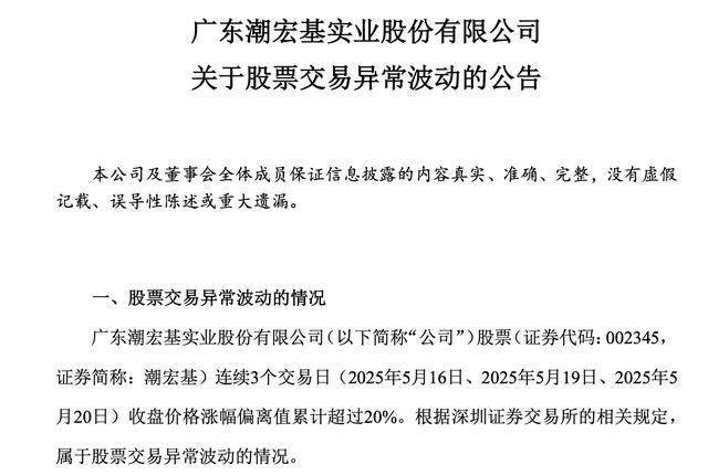 瑞财经 吴文婷 5月20日,潮宏基发布关于股票交易异常波动的公告。