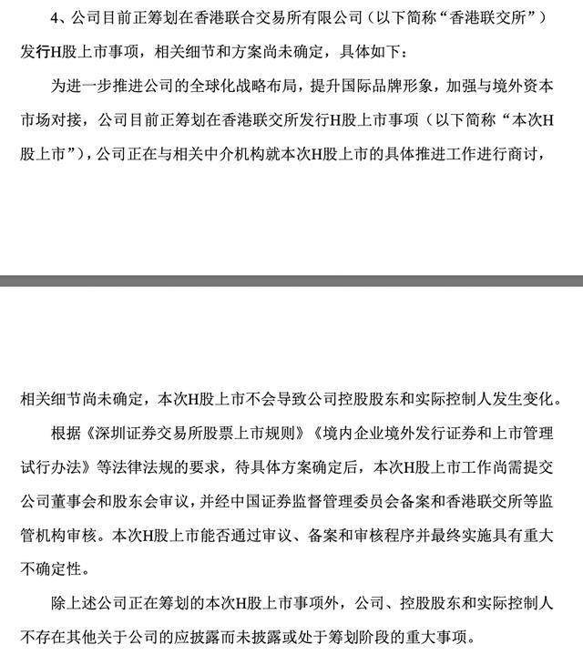 其中提及,为进一步推进公司的全球化战略布局,提升国际品牌形象,加强与境外资本市场对接,公司目前正筹划在香港联交所发行H股上市事项,公司正在与相关中介机构就本次H股上市的具体推进工作进行商讨,相关细节尚未确定,本次H股上市不会导致公司控股股东和实际控制人发生变化。