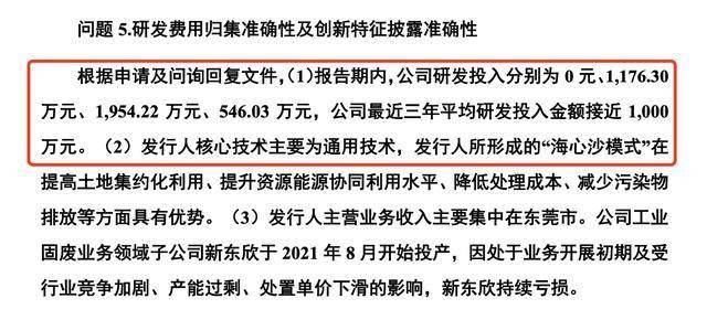 根据申请及问询回复文件,2021年-2024年,公司研发投入分别为0元、1,176.30万元、1,954.22万元、546.03万元,公司最近三年平均研发投入金额接近1,000万元。公司核心技术主要为通用技术,所形成的“海心沙模式”在提高土地集约化利用、提升资源能源协同利用水平、降低处理成本、减少污染物排放等方面具有优势。