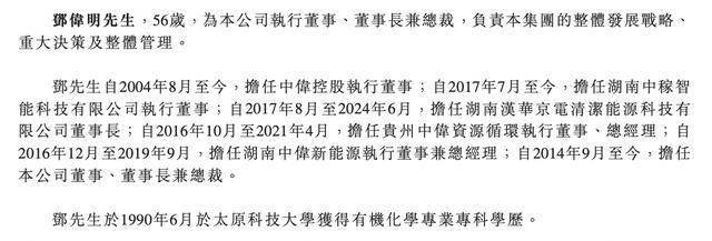 资料显示,邓伟明,现年56岁,为公司执行董事、董事长兼总裁,负责集团的整体发展战略、重大决策及整体管理。