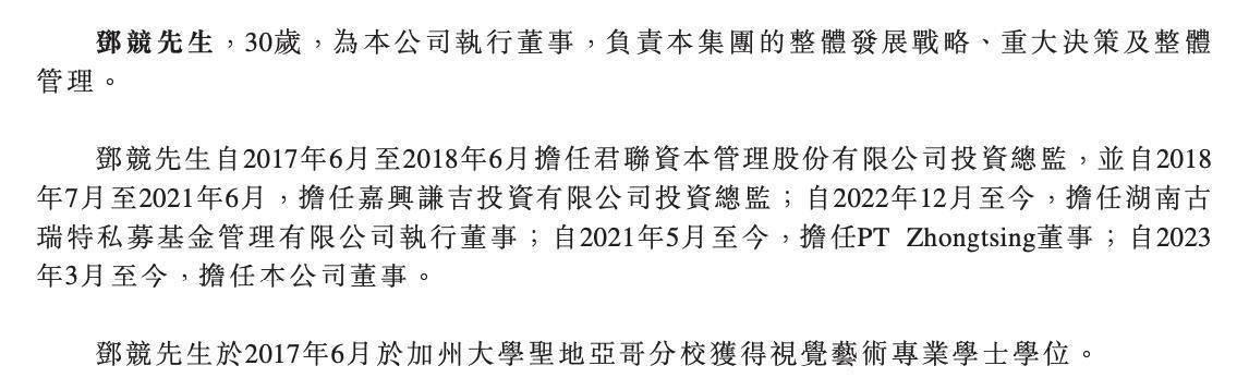 邓竞,现年30岁,为公司执行董事,负责集团的整体发展战略、重大决策及整体管理。