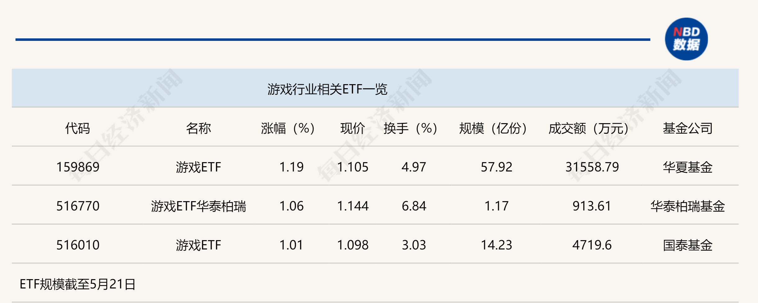 点评:游戏ETF(159869)、游戏ETF华泰柏瑞(516770)以及游戏ETF(516010)今日上午分别上涨1.19%、1.06%和1.01%。其中,游戏ETF(159869)规模较大,达到57.92亿份,其半日成交金额为3.16亿元。上述三只ETF均追踪的是中证动漫游戏指数。