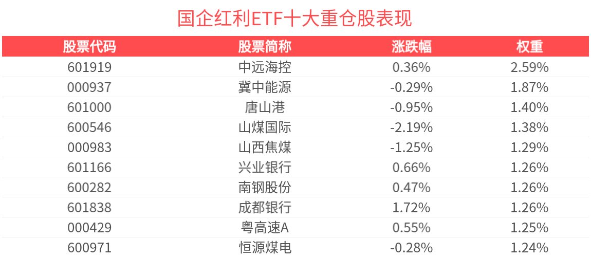 数据显示,截至2025年4月30日,中证国有企业红利指数(000824)前十大权重股分别为中远海控(601919)、冀中能源(000937)、渝农商行(601077)、上海银行(601229)、成都银行(601838)、山煤国际(600546)、粤高速A(000429)、中国神华(601088)、山西焦煤(000983)、沪农商行(601825),前十大权重股合计占比15.18%。