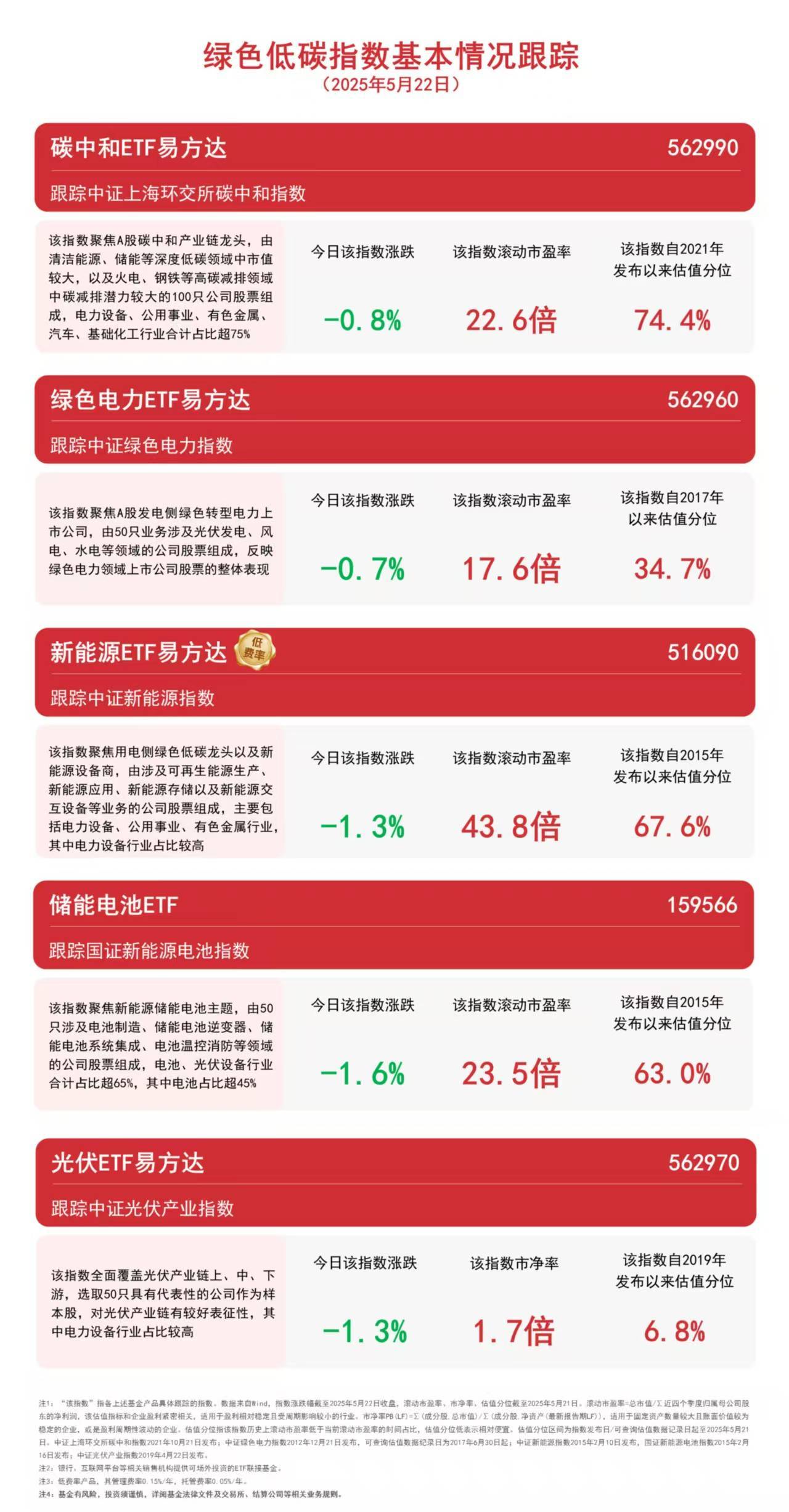 截至收盘,中证绿色电力指数下跌0.7%,中证上海环交所碳中和指数下跌0.8%,中证新能源指数、中证光伏产业指数均下跌1.3%,国证新能源电池指数下跌1.6%。