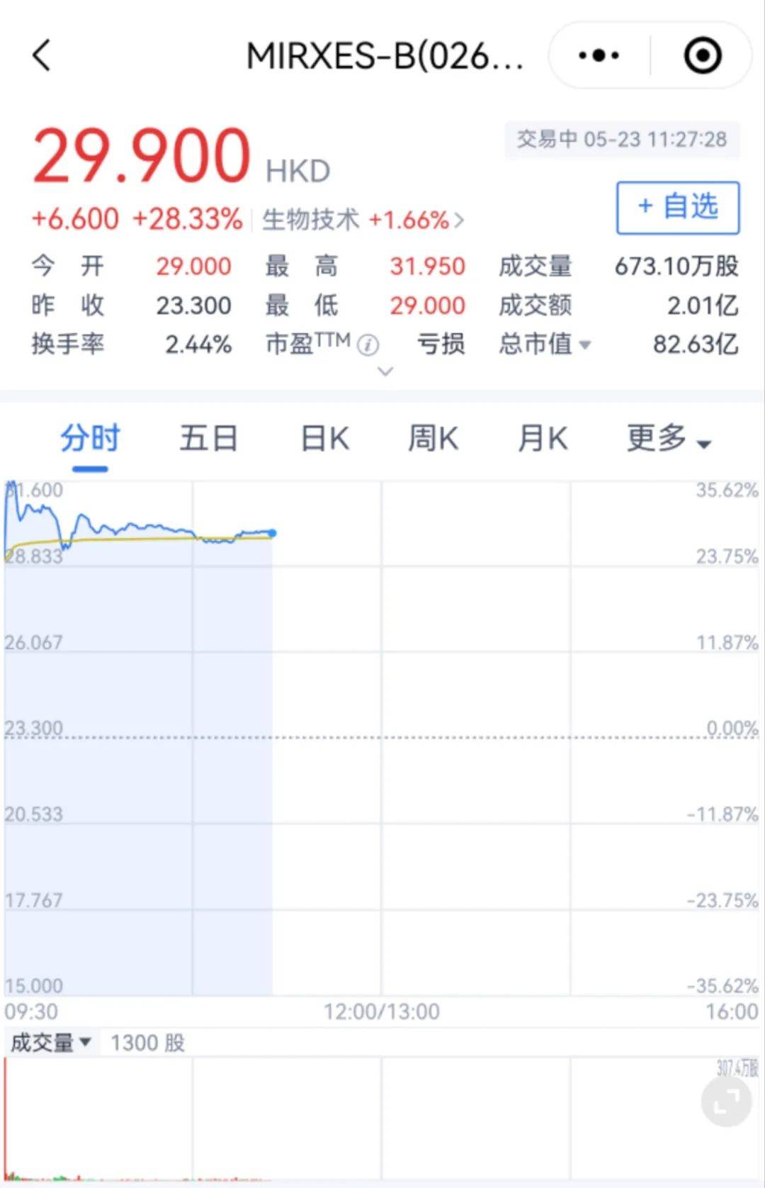 5月23日,Mirxes Holding Company Limited(简称:“觅瑞”)在港交所主板上市。觅瑞发行价为23.3港元,开盘涨24.89%至29港元;截至发稿,每股涨28.33%至29.9港元,总市值82.62亿。
