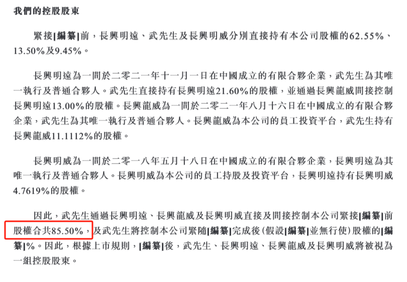 根据聆讯资料集披露,创始人武英杰通过长兴明远、长兴龙威及长兴明威直接及间接控制公司发行前股权合计85.50%。