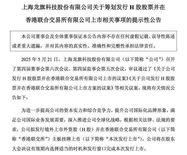瑞财经 吴文婷5月21日,龙旗科技发布公告称,为进一步提高公司的资本实力和综合竞争力,提升公司国际化品牌形象,满足公司国际业务发展需要,深入推进公司全球化战略,公司拟发行境外上市外资股(H股)并在香港联合交易所有限公司主板挂牌上市。公司将在股东大会决议有效期内选择适当的时机和发行窗口完成本次发行上市。
