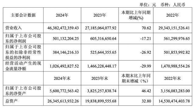 2024年,龙旗科技实现营收为463.82亿元,同比增长70.62%;归母净利润为5.01亿元,同比减少17.21%。