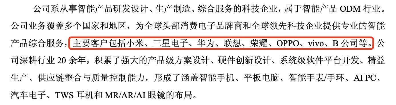 公开资料显示,龙旗科技系从事智能产品研发设计、生产制造、综合服务的科技企业,属于智能产品ODM行业。公司业务覆盖多个国家和地区,为全球头部消费电子品牌商和全球领先科技企业提供专业的智能产品综合服务,主要客户包括小米、三星电子、华为、联想、荣耀、OPPO、vivo、B公司等。