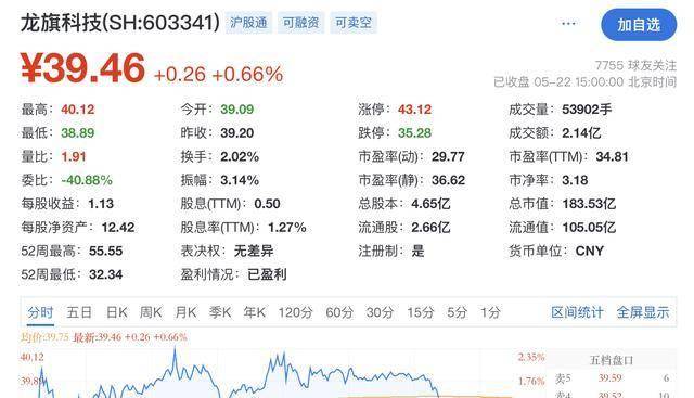 截至发稿时,龙旗科技A股报39.46元,涨0.66%,总市值约183.53亿元。