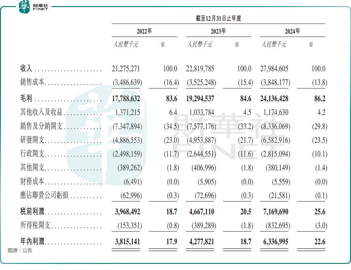 利润方面,2022年至2024年,年内利润分别为38.15亿元、42.78亿元、63.37亿元。另外,2022年至2024年的净利润率分别为17.9%、18.7%、22.6%。