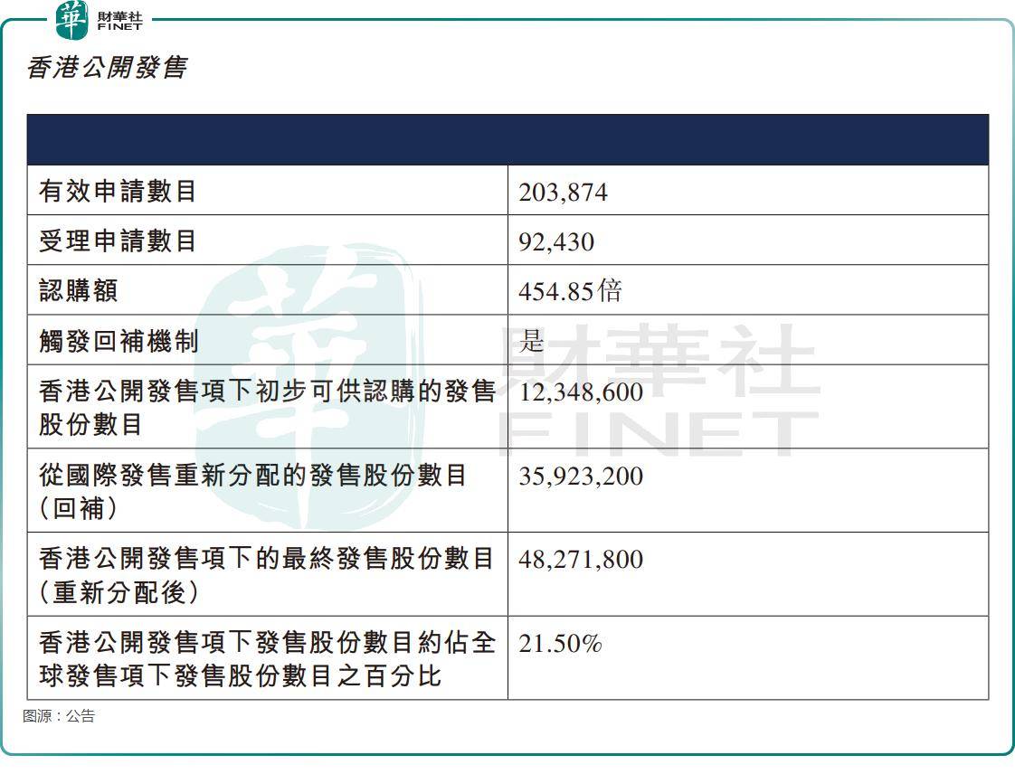 恒瑞医药香港公开发售获得454.85倍认购,国际发售获得17.09倍认购。