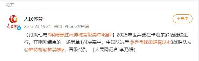 据@人民体育 消息,2025年世乒赛在卡塔尔多哈继续进行。在刚刚结束的一场男单1/4决赛中,中国队选手梁靖崑以4:3战胜队友林诗栋,晋级4强。(人民网记者 李乃妍)