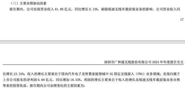2024年,公司实现营业收入81.89亿元,同比增长6.13%,剔除锐凌无线车载前装业务的影响,公司营业收入同比增长23.34%;收入的增长主要来自于国内汽车电子及智慧家庭领域中5G固定无线接入(FWA)业务领域;实现归属于上市公司股东的净利润6.68亿元,同比增加18.53%,利润的增长主要来自于收入的增长及锐凌无线车载前装业务出售带来的投资收益。