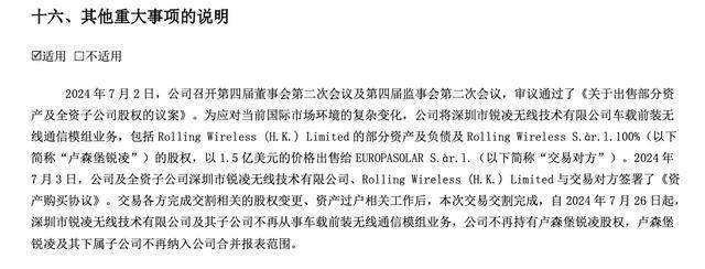 具体而言,2024年7月2日,公司召开第四届董事会第二次会议及第四届监事会第二次会议,审议通过了《关于出售部分资产及全资子公司股权的议案》。为应对当前国际市场环境的复杂变化,公司将深圳市锐凌无线技术有限公司车载前装无线通信模组业务,包括Rolling Wireless (H.K.) Limited的部分资产及负债及Rolling Wireless S.àr.l.100%(以下简称“卢森堡锐凌”)的股权,以1.5亿美元的价格出售给EUROPASOLAR S.àr.l.。