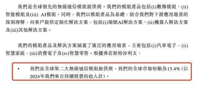 广和通是物联网模组龙头企业,公司的模组产品包括数传模组、智能模组及AI模组。根据弗若斯特沙利文,公司是全球第二大无线通信模组提供商,其全球市场份额为15.4%。