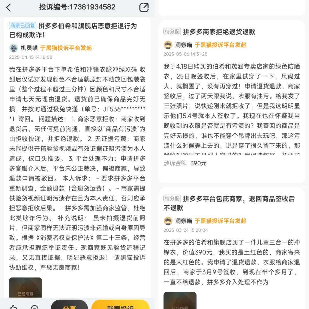 在黑猫投诉平台上,关于伯希和的投诉达400余条,主要集中在退货退款和质量品控问题。