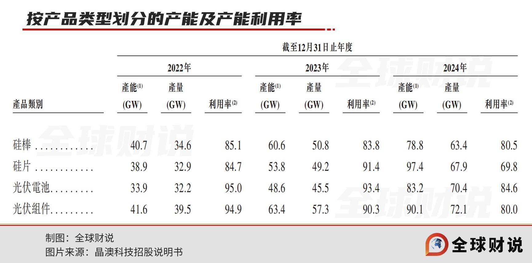 2024年,晶澳科技各项产品产能利用率均同比下降。