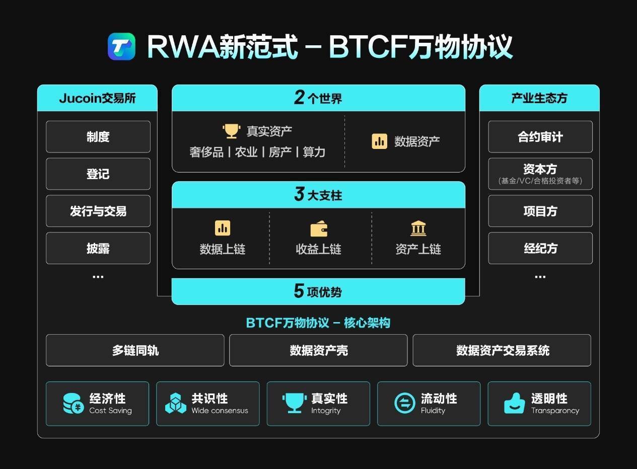 BTCF万物协议(BTCF Protocol)是由全球头部加密资产交易所 JUCOIN 发起的核心RWA(Real World Assets)生态协议,致力于实现传统资产的链上数字化流通。该项目以“构建全球资产数字化新基础设施”为核心愿景,覆盖房地产、大宗商品、应收账款、比特币算力等现实资产,通过区块链技术实现资产上链、流转与管理,打通传统金融与数字金融的边界,成为Web3与实体经济融合的关键通道。
