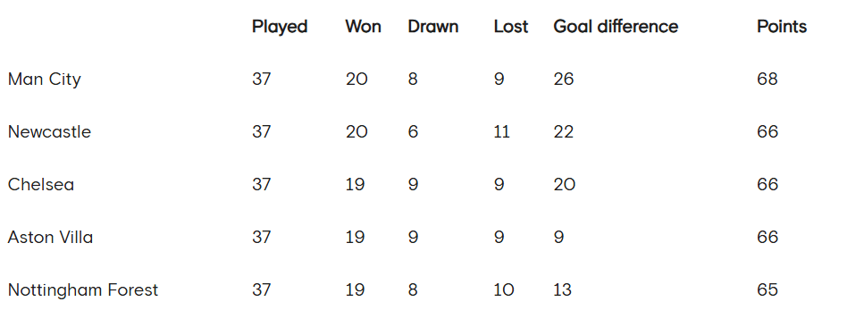 曼城和纽卡斯尔只要赢球就能确保进入积分榜前五,如果维拉击败曼联且取得更多净胜球,他们也能进入前五。诺丁汉森林想要拿到欧冠资格必须赢切尔西,而且需要维拉不会获胜。如果诺丁汉森林只拿到一场平局,那么即使维拉输球他们也无法进入前五。