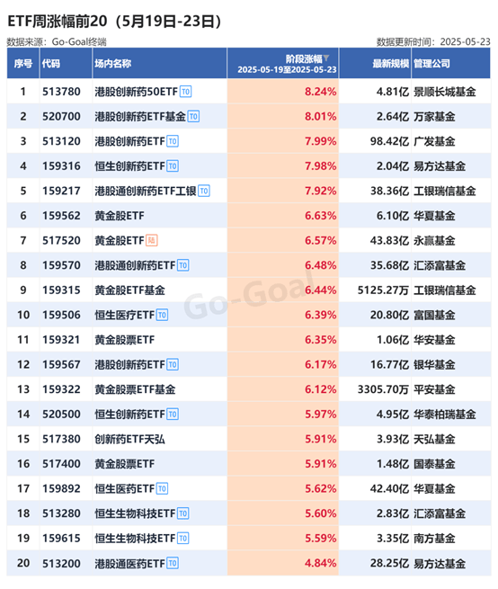Go-Goal ETF数据显示,ETF市场本周震荡分化,港股创新药及黄金相关品种领涨,A股科技相关品种承压。其中,港股创新药50ETF、恒生创新药ETF等涨幅居前;因国际金价反弹,黄金股ETF单周涨幅超6%。与此同时,金融科技、软件类ETF小幅回调。