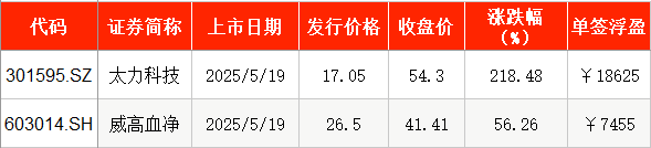 5月19日,威高血净在上海证券交易所(下称“上交所”)主板正式挂牌上市,发行价为26.5元/股,截至上市首日收盘,该股报41.41元/股,涨幅为56.26%。以收盘价计算,投资者中一签浮盈为7455元。