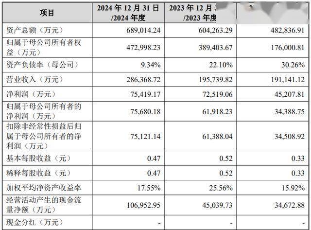 业绩方面,2022-2024年,公司营业收入分别为19.11亿元、19.57亿元和28.64亿元;归属于母公司股东的净利润分别为3.44亿元、6.19亿元和7.57亿元。