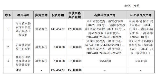 本次IPO,盛龙股份拟使用募集资金额15.3亿元,用于“河南省嵩县安沟钼多金属矿采选工程项目”、“矿业技术研发中心项目”及“补充流动资金及偿还银行贷款项目”。