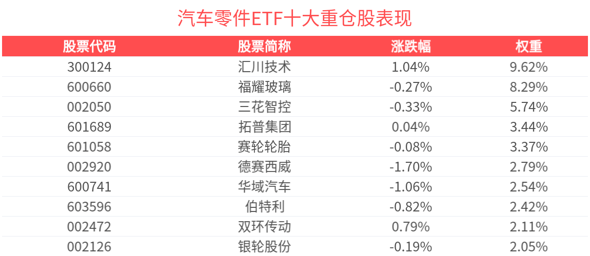 汽车零件ETF紧密跟踪中证汽车零部件主题指数,中证汽车零部件主题指数从沪深市场中选取100只业务涉及汽车系统部件、汽车内饰与外饰、汽车电子、轮胎等领域的上市公司证券作为指数样本,反映汽车零部件主题上市公司证券的整体表现。