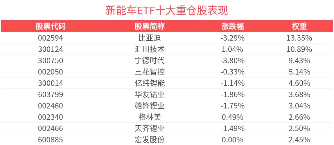 数据显示,截至2025年4月30日,中证新能源汽车产业指数(930997)前十大权重股分别为比亚迪(002594)、汇川技术(300124)、宁德时代(300750)、三花智控(002050)、亿纬锂能(300014)、华友钴业(603799)、赣锋锂业(002460)、格林美(002340)、天齐锂业(002466)、宏发股份(600885),前十大权重股合计占比58.64%。