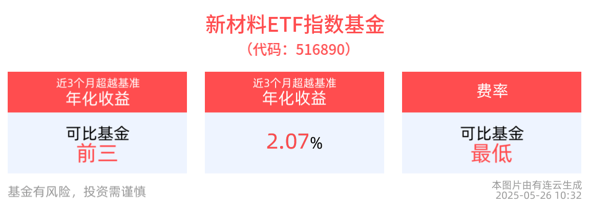 从收益能力看,截至2025年5月23日,新材料ETF指数基金自成立以来,最高单月回报为24.74%,最长连涨月数为3个月,最长连涨涨幅为29.18%,上涨月份平均收益率为6.75%。截至2025年5月23日,新材料ETF指数基金近3个月超越基准年化收益为2.07%,排名可比基金前3/7。