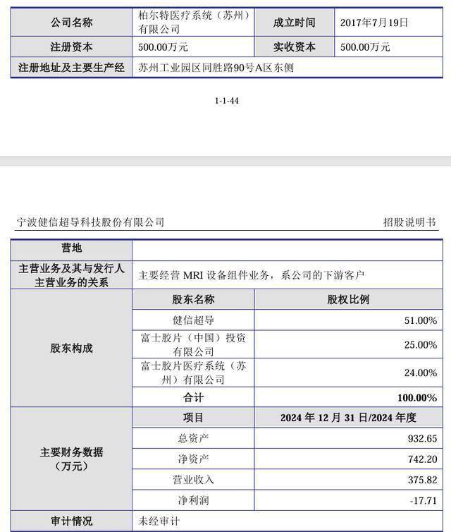 更深入的关联关系显示,健信超导与日立医疗(2021年3月其影像诊断相关业务被富士胶片集团收购)合资成立了柏尔特医疗系统(苏州)有限公司,主营MRI设备组件业务。