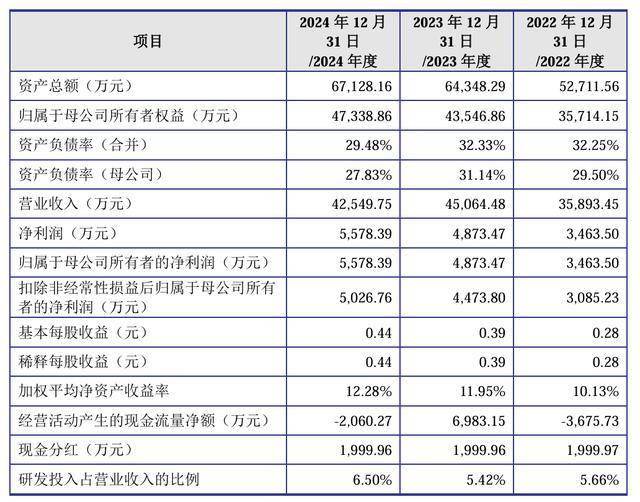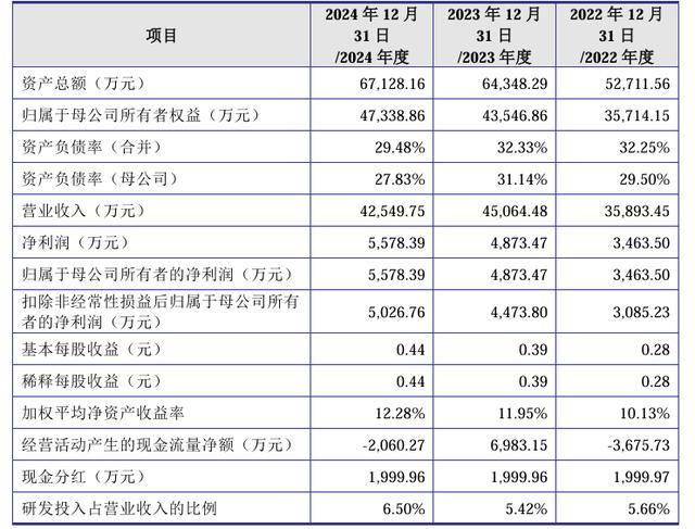 总体来看健信超导于报告期各期的业绩,2022年至2024年,公司分别实现营收3.59亿元、4.51亿元、4.25亿元,分别实现扣非归母净利3,085.23万元、4,473.80万元、5,026.76万元。虽然盈利保持一定增长,但2024年的营收略有下降。