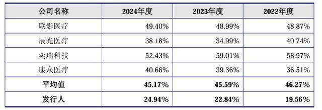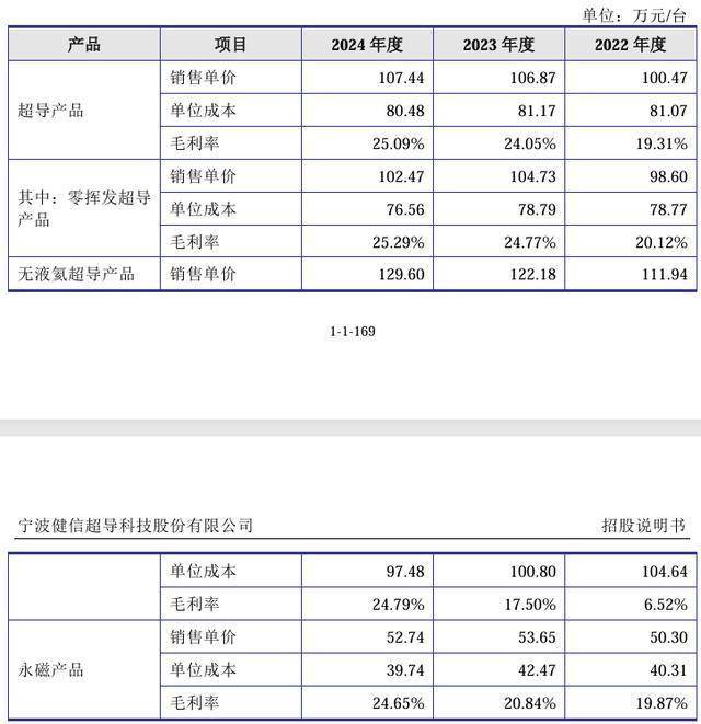 2022年至2024年,健信超导的超导磁体产品成本分别为81.07万元/台、81.17万元/台和80.48万元/台,产品毛利率分别为19.31%、24.05%和25.09%。同期,健信超导的综合毛利率分别为19.56%、22.84%和24.94%,这显著低于其同行业可比上市公司。