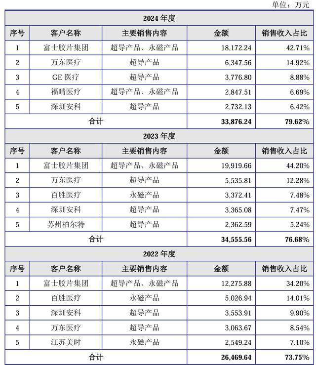 数据显示,报告期各期,健信超导前五大客户合计贡献的营收占比呈现逐年上升趋势,从2022年的73.75%攀升至2024年近80%,其中对第一大客户富士胶片控股株式会社(以下称“富士胶片集团”)的依赖尤为突出。