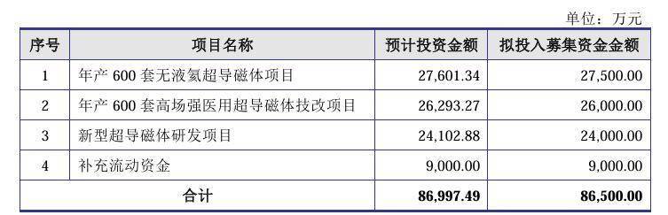 此次IPO,健信超导计划募资8.65亿元,分别投向“年产600套无液氦超导磁体”、“年产600套高场强医用超导磁体技改”、“新型超导磁体研发项目”及补充流动资金。