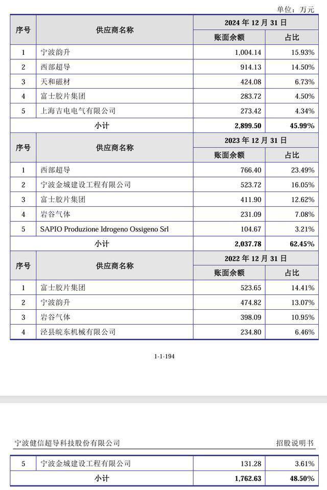 不过,富士胶片集团于各期并不是健信超导的前五大供应商之一。根据招股书,报告期各期健信超导向前五名原材料供应商合计采购金额占当期原材料采购总额的比例分别为66.60%、65.94%和58.6%,各期排在前两名的供应商分别为西部超导、宁波韵升(600366.SH)。而递表前,宁波韵升是健信超导的第三大股东,持有其8.72%的股份。