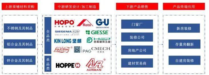 门窗五金行业的上游主要为锌合金、铝合金、不锈钢等金属制品生产企业,中游企业负责产品研发设计和加工制造,下游客户主要为门窗厂、装修公司、房地产公司、建材贸易商等,产品主要用于新建、存量住宅。